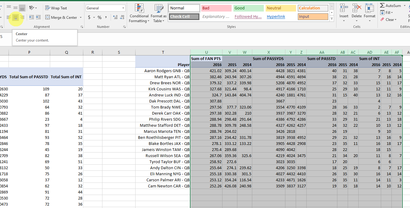 Let's do the same for the other categories. Once you merge the cells, let's change the names from Sum of Fan PTS, Sum of PASSYDS, Sum of PASSTDS, and Sum of INT to: Fantasy Points, Passing Yards, Passing TD's, and Interceptions.