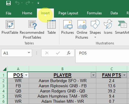 Right-click anywhere in the 2016 Fantasy points column (column B in this case), and sort from Largest to Smallest so that our lists starts with the top fantasy performers for 2016.